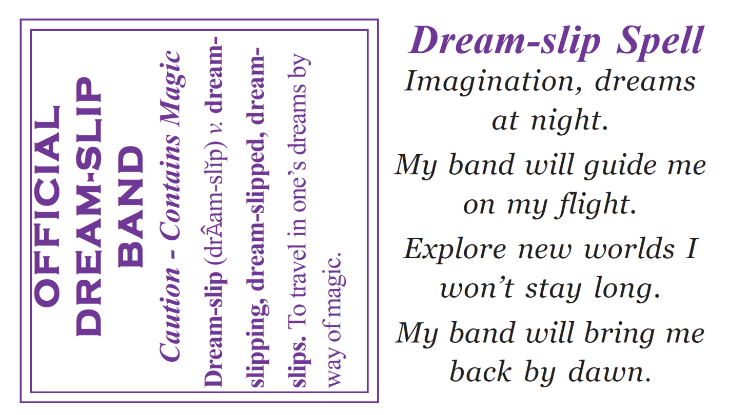 There are many types of dream-slip bands. A simple circular band takes you to a magical world when you fall asleep on earth. When you fall asleep in the magical world, the dream-slip band brings you back home to the exact spot where you began your dream. It takes you there and brings you back.