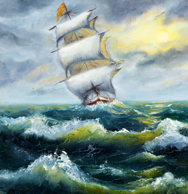 Aboard the single ship, men strained, pulling ropes and changing angles of the sails when the captain shouted orders. The ship grabbed the attention of the nymphs who stirred the sea to bounce and tip the struggling vessel. Above the clouds, the gods watched and laughed until a single voice rang out. Its loudness pushing back, stilling a howl from the wind.